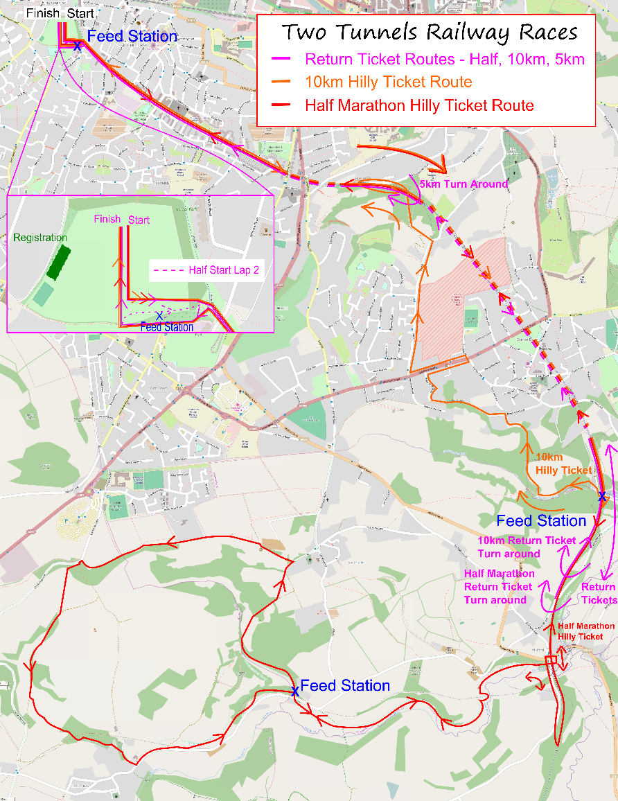 There are 3 different half marathon routes, known as Return Ticket, Hilly Ticket and City Ticket, being run through the Two Tunnels this year, please scroll down to find the course details for the date you are looking at racing.
