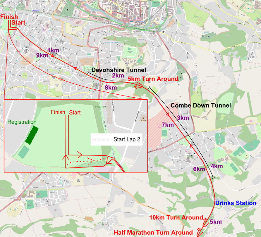 Tunnel runners head over Tucking Mill viaduct where there will be a drinks station. Shortly after the drinks station runners will retrace their steps back through the Combe Down and Odd Down Tunnels. When runners return to the Brickfields site you will need to turn right to start your 2nd lap and merge with 10km runners heading out on to the course to complete a loop of the course again. When returning to Brickfields for a 2nd time you will need to turn left and head directly to the finish line.