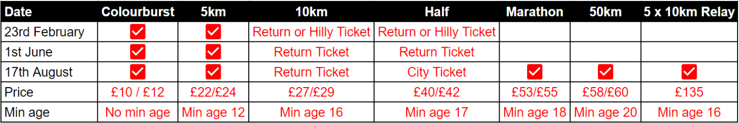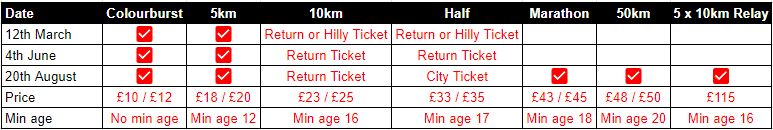 Distances: We have a Colourburst, 5km, 10km, Half Marathon, Marathon, 50km Solo, 50km Pair and 5x10km Relay to choose from. The 5km, Return Ticket 10km, Return Ticket Half Marathon, 50km Solo/Pair and 5 x 10km Relay races are all officially measured by UK Athletics.