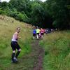 The first Feed Station (FS) is a welcome site and will offer a great time opportunity to refresh and replenish following the tough climb. From here there is a gradual rise, which kicks up at the end as runners enter Piney Sleight. Some good flat running ahead for the next 800m or so past the 3 mile marker. Coming up next is a short, steep and stoney descent - take care here. You will also see runners from the 6km race joining you at the point. All routes converge and carry on up the other side of the dip. As you contour around the ridge you will have really nice views across the valley to the event village and festival site.