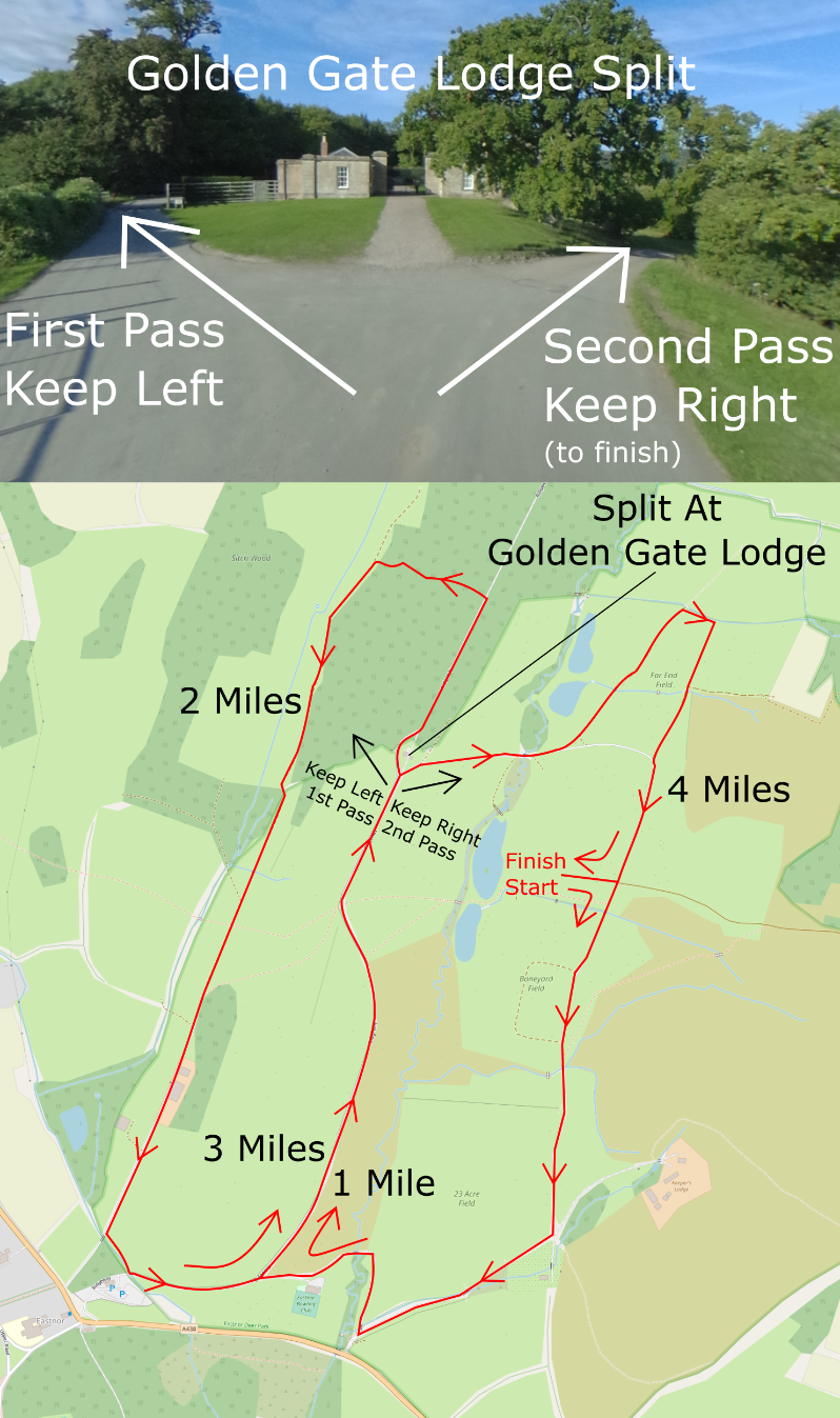 The initial road section runs South with great views of Eastnor Castle and is a downhill section. As runners join the central road, the route starts to climb slowly towards the split point at Golden Gates Lodge. On the first pass the runners bear left and loop around the side of the gate house. The next section is wooded and moves from tarmac road to farm track, which a winding decent as the route bears left and downhill.